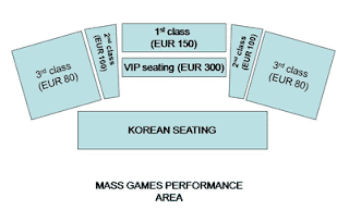 Vé Arirang chia theo các class khác nhau, tùy thuộc vị trí tương quan so với sân khấu chính, rẻ nhất là 80EUR cho đến mức 300EUR (riêng vé cho người Bắc Hàn và người Nam Hàn thì chúng tôi không biết giá).